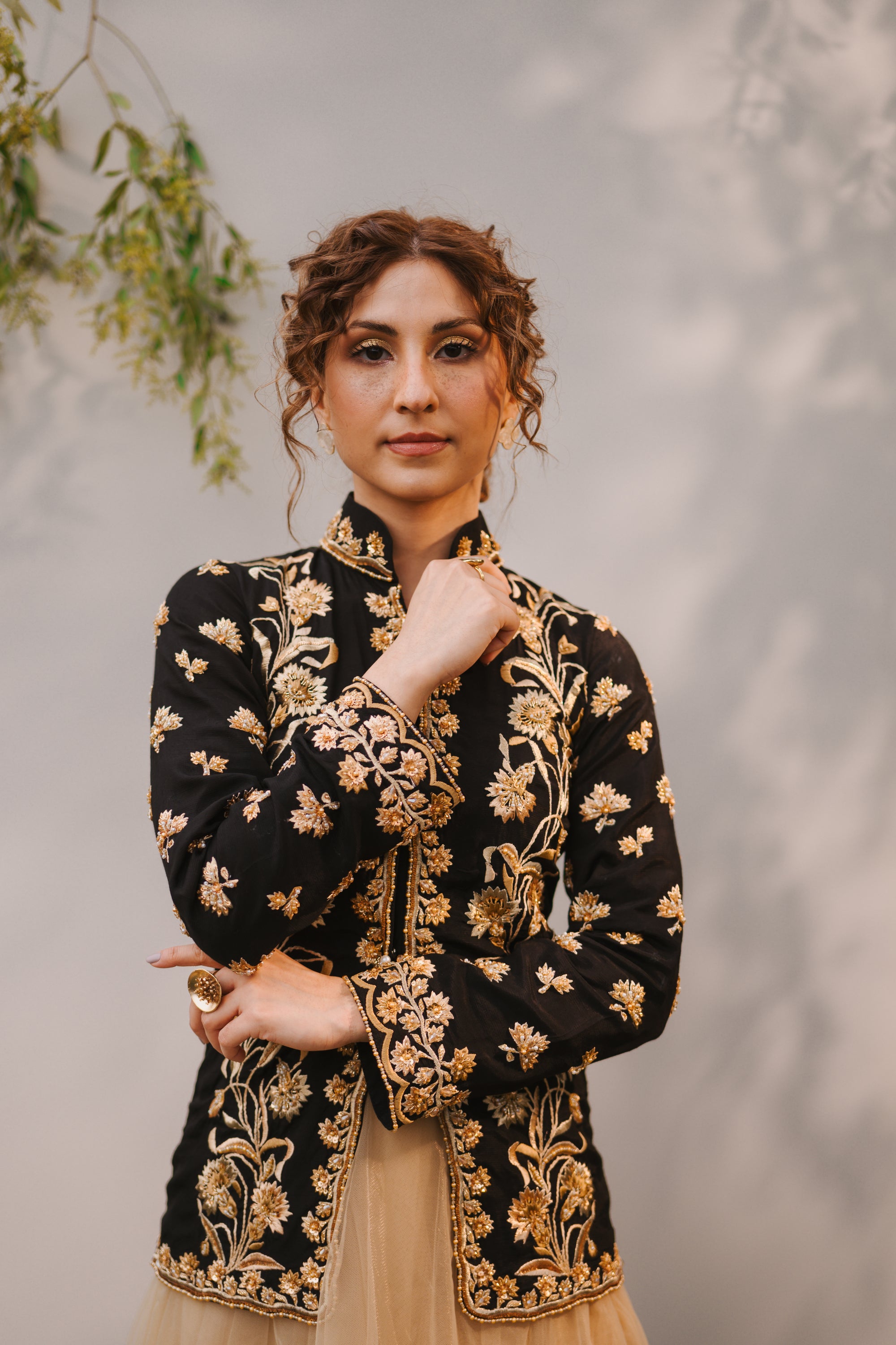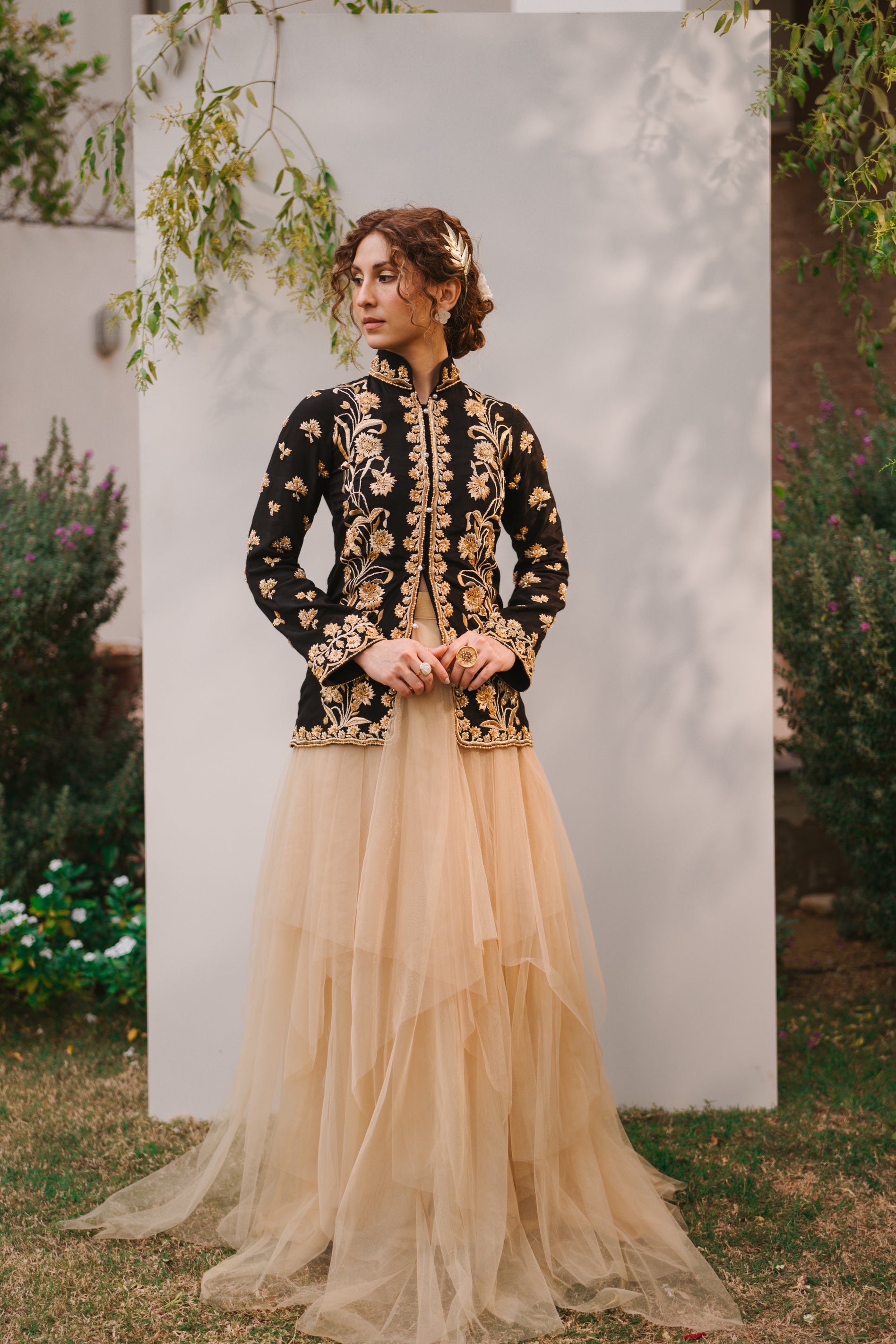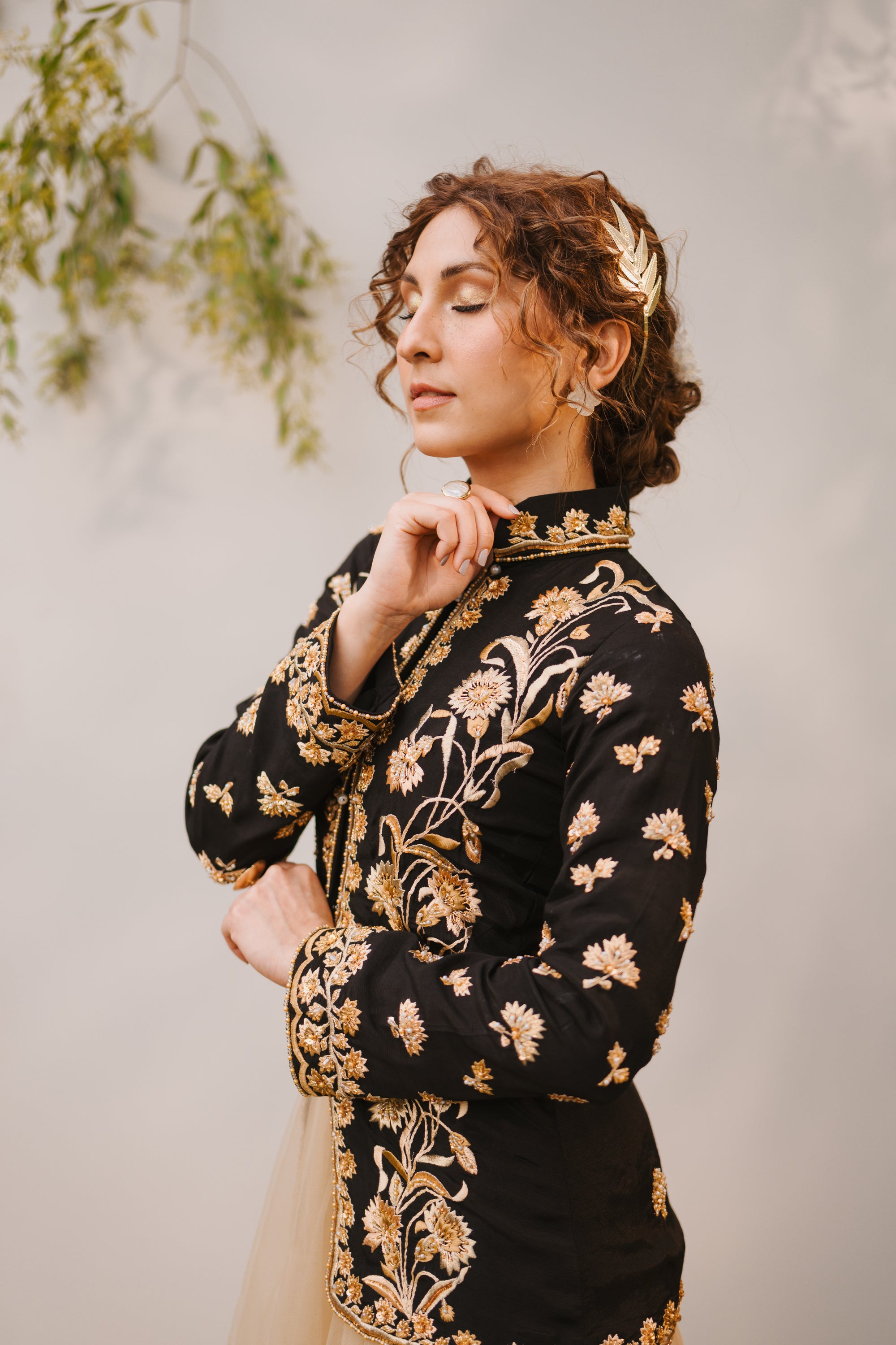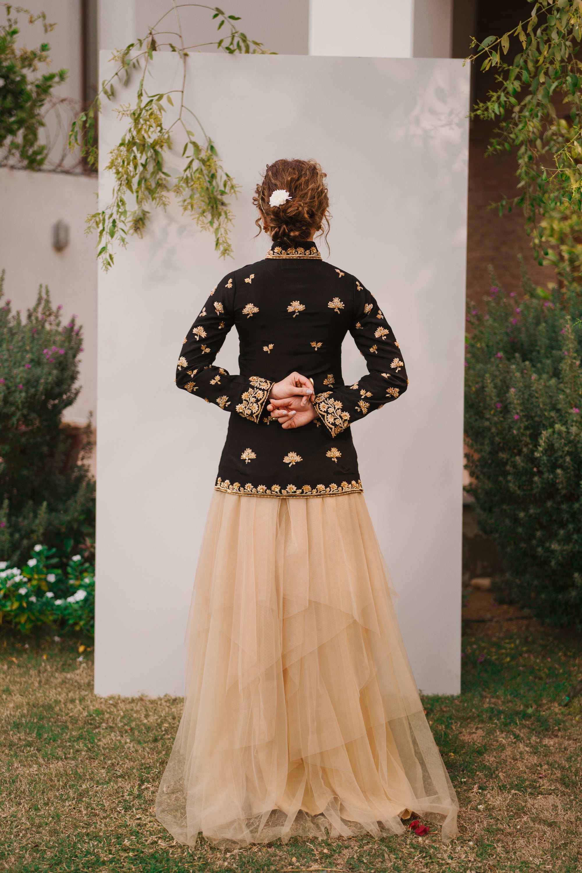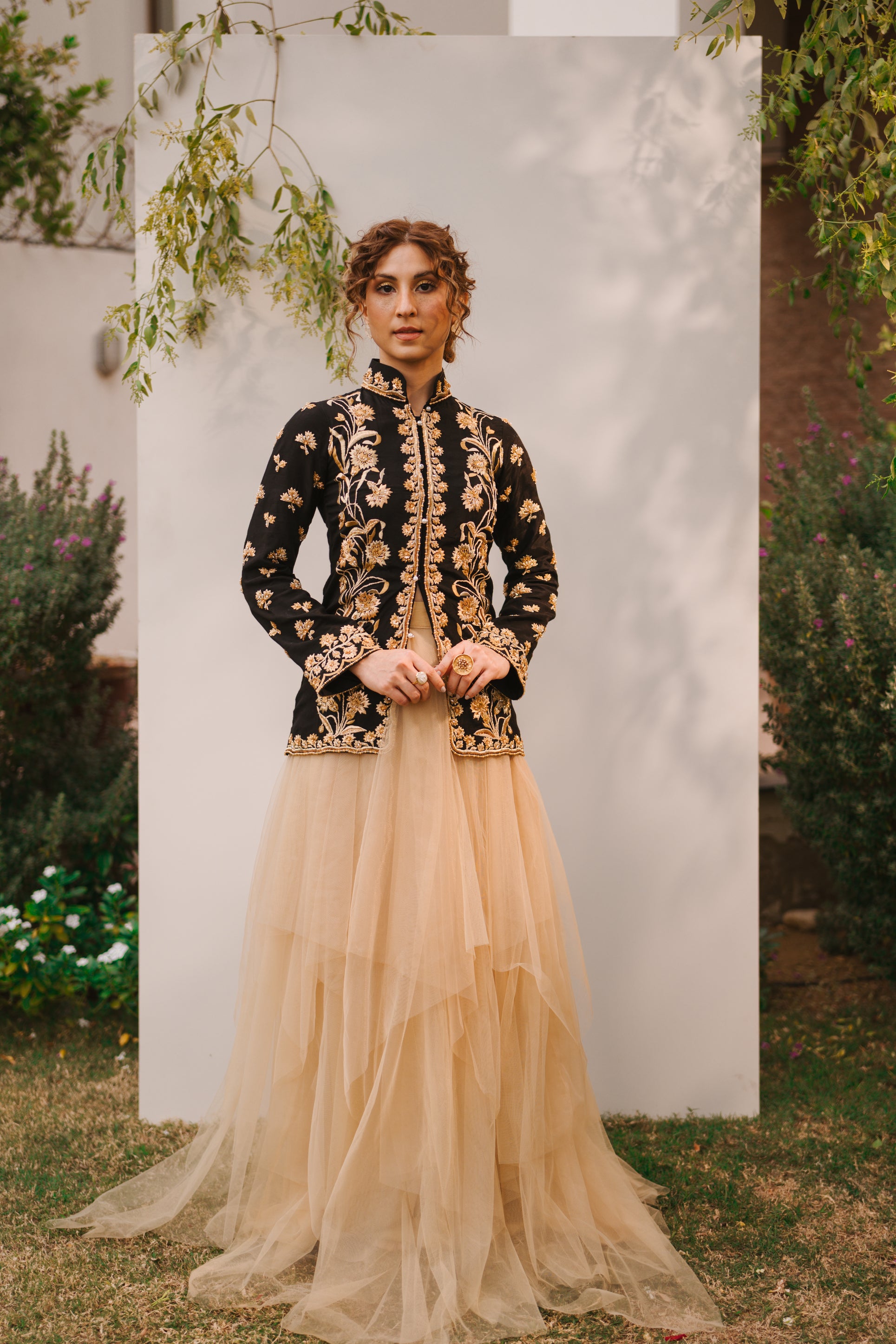 A striking black-gold ensemble comprises of a modern jacket and a flared skirt. The jacket is cut from deep, rich black raw silk, meticulously embroidered with golden threads, and further elevated with hand embellishments. Paired with a jacket is a light gold net lehenga which perfectly complements the richness of the black. A showstopping outfit that blends modern aesthetics with timeless elegance.