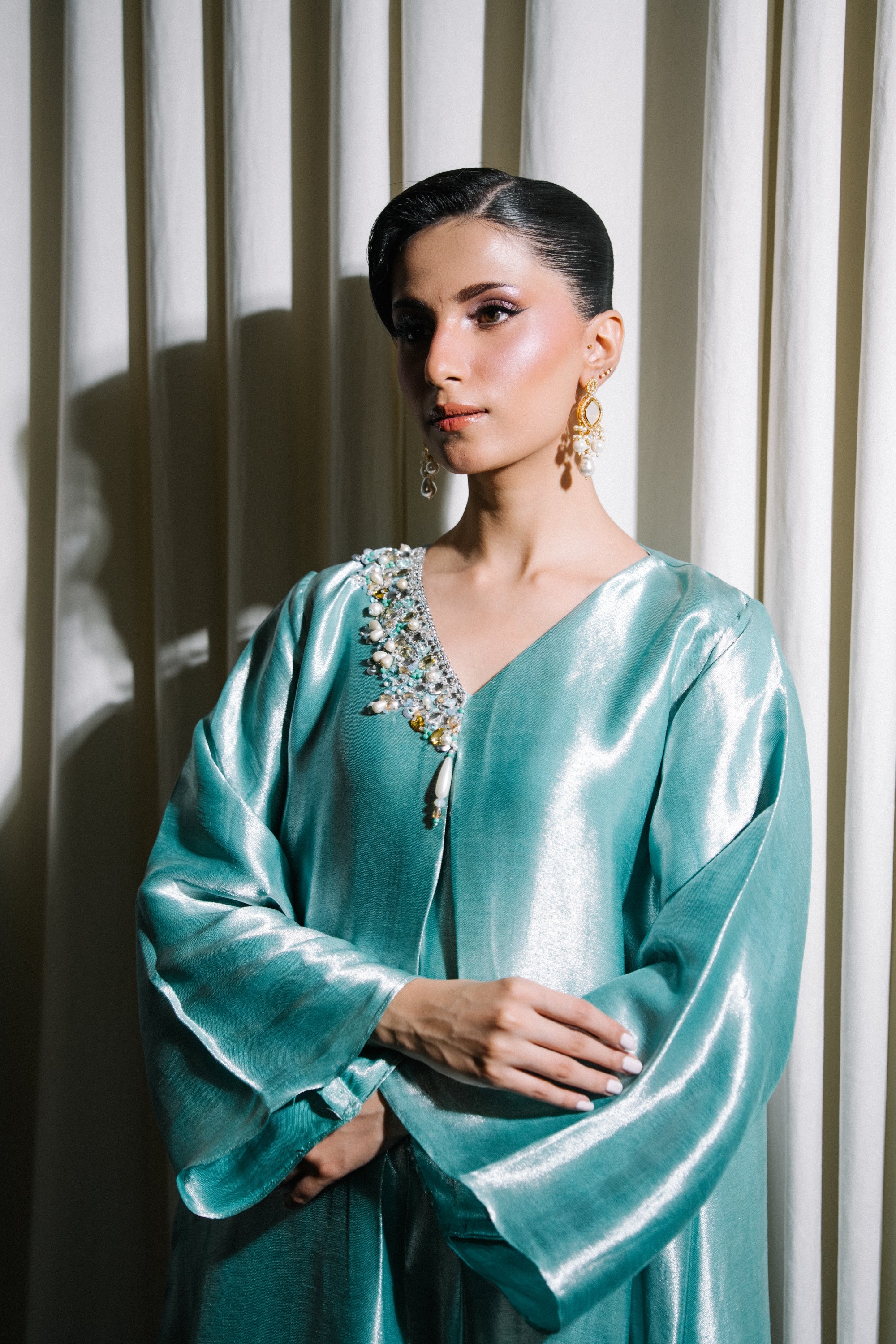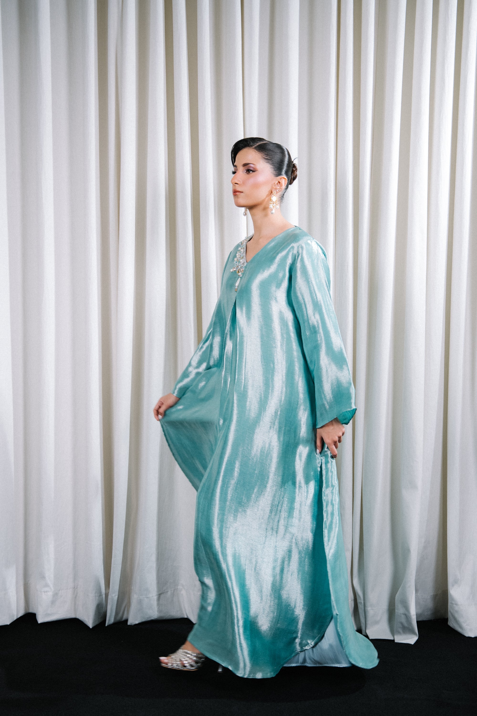 A luminous sky blue kaftan abaya crafted from pure satin lama, delicately embellished with hand-applied crystals and layered over a silk inner in a softly lighter tone.
